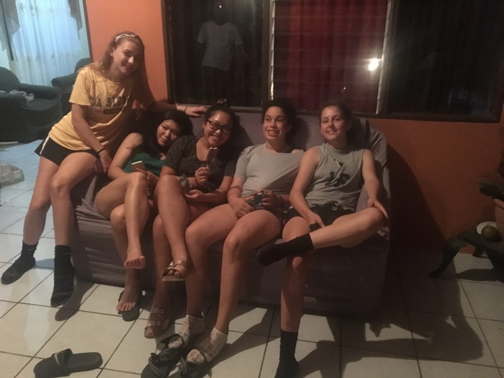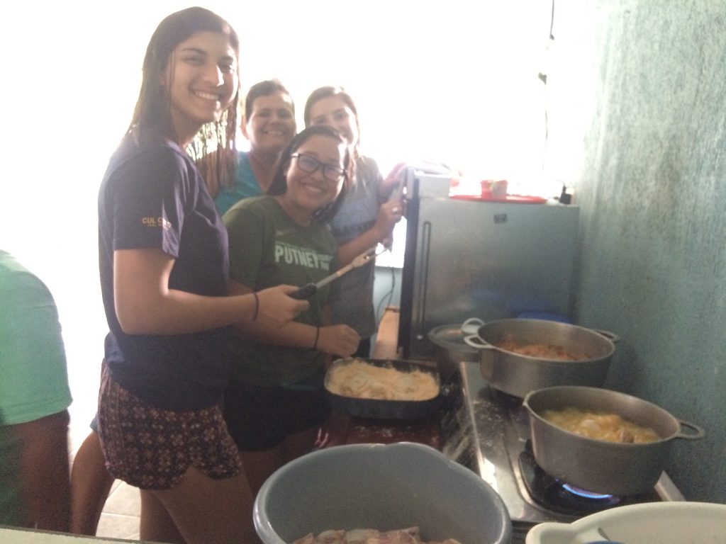 Sabrina, Rachel, and Boyce learning how to cook traditional meals from Maria Elsie.