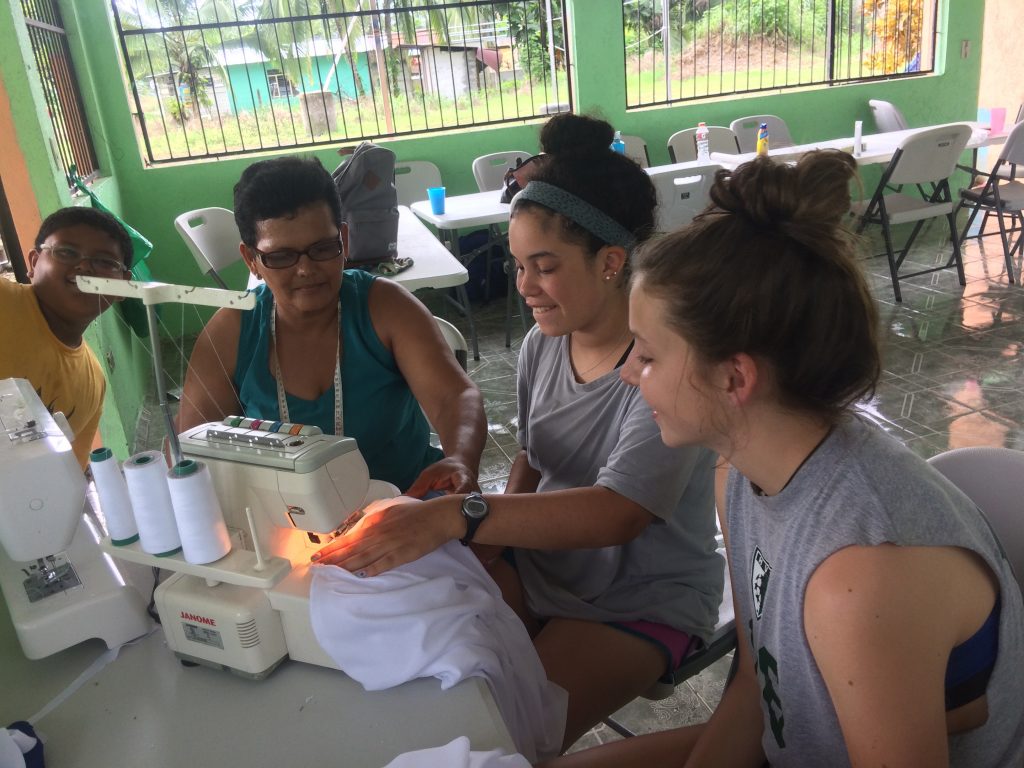 Ellika, Logan, and Alice concentrating on how to make t-shirts with Maria Elsie.